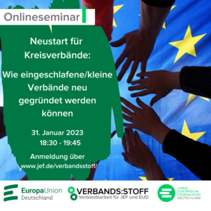 Am 31. Januar 2023 um 18:30 Uhr findet wieder die Verbands:stoff Online-Akademie von Europa-Union und JEF statt. Das Thema dieser ersten Ausgabe im neuen Jahr lautet „Neustart für Kreisverbände: Wie eingeschlafene/kleine Verbände neu gegründet werden können“. Dabei geht es auch darum, wie man vor Ort neue Mitglieder gewinnt.   » weiterlesen