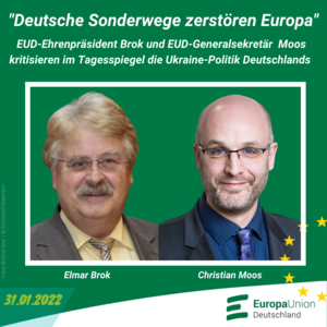 In einem Gastbeitrag für den Tagesspiegel kritisierten EUD-Ehrenpräsident Brok und EUD-Generalsekretär Moos die Ukraine-Politik Deutschlands: „Deutsche Eliten zeigen Verständnis für vermeintlich berechtigte russische Sicherheitsanliegen. Für die Lösung der Ukraine-Krise ist das fatal.“ Deutschlands Verbündete fragten sich zu Recht, ob das Land noch einen klaren Kompass habe. » weiterlesen