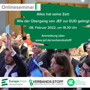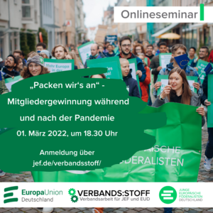 Die Pandemie hält unsere Verbände seit zwei Jahren in Atem. Viele Aktivitäten von JEF und EUD wurden in den digitalen Raum verlegt, mussten abgesagt werden oder fanden nur in abgespeckter Form statt. Persönliche Begegnungen waren selten, neue Beitritte auch. Jetzt ist es an der Zeit wieder loszulegen und Menschen für uns zu begeistern. Wie wir Mitglieder (trotz Pandemie) gewinnen und welche Formate sich dafür eignen, darum geht es bei unserer nächsten #verbands:stoff Akademie am 1. März 2022. » weiterlesen