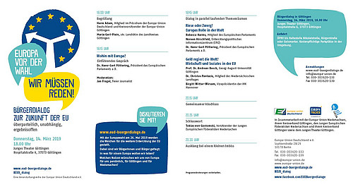 Am 11.02.2019 um 18 Uhr im Bovender Rathaus und am 21.02.2019 um 19 Uhr im Alten Rathaus zu Göttingen Bürgerdialoge mit örtlichen Politikern statt. Kommen Sie vorbei und diskutieren Sie mit - in Zeiten des Brexit und der anstehenden Europawahlen sicherlich sehr interessant die verschiedenen Meinungen der Parteien zu Europa aus erster Hand zu erfahren. Weitere Informationen finden Sie in unserem Veranstaltungsflyer (LINK) PS: Die Bürgerdialoge sind natürlich für jeden zugänglich und kosten keinen Eintritt! » weiterlesen