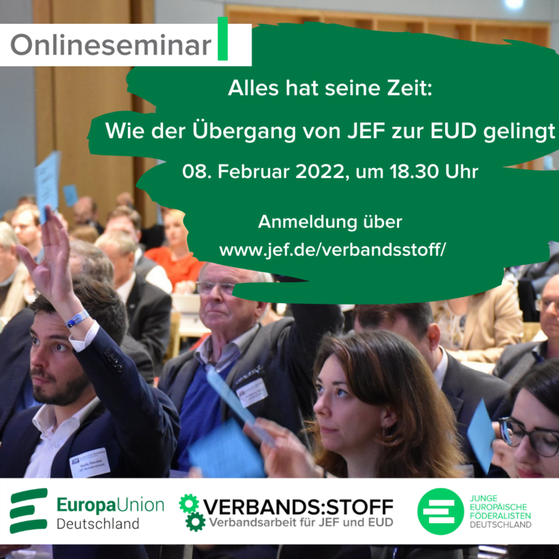 Wie der Übergang von der JEF zur Europa-Union gelingt, ist eine wichtige Frage der Mitgliederbindung. Gerade nach zwei Jahren Pandemie, die die Mitgliederentwicklung negativ beeinflusst hat, ist es wichtig, diese Gruppe in den Blick zu nehmen. Am Dienstag, den 8. Februar 2022, führen EUD und JEF von 18.30 bis 19.45 Uhr zu diesem Thema eine online Akademie durch.