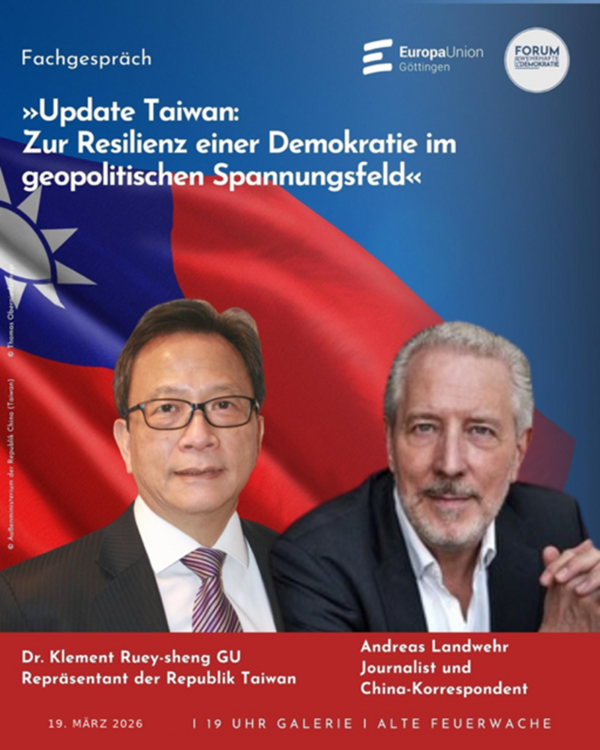 Wir laden als Göttinger Europa-Union gemeinsam mit dem Forum für wehrhafte Demokratie zu einem aktuellen Fachgespräch über Taiwan ein. Unter dem Titel „Update Taiwan: Zur Resilienz einer Demokratie im geopolitischen Spannungsfeld“ wollen wir am Donnerstag, 19. März 2026, um 19:00 Uhr in der Galerie Alte Feuerwache, Ritterplan 4, 37073 Göttingen, der Frage nachgehen, wie sich Taiwan als demokratisches Gemeinwesen in einem zunehmend angespannten internationalen Umfeld behauptet und welche Formen gesellschaftlicher und politischer Resilienz dort entwickelt wurden.